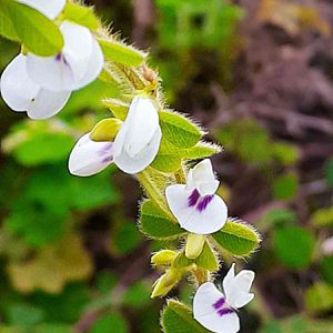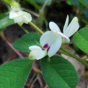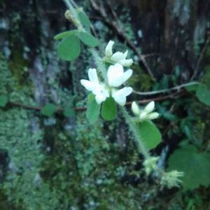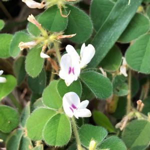 草むらを這うように伸びたツルを持ち上げると… 8ミリくらいの、白い萩のような花が🤍🌿 《猫萩》でした🥰 ฅ^•ω•^ฅニャン💜 名前の由来は、毛深い茎と葉っぱ☘️ 互い違いに3枚ずつ並んでます 似た花に、《犬萩》🐶あり ワオーン♬