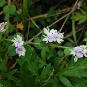 猫萩 マメ科 ハギ属 花期7〜9月 分布地 日本では 本州から九州 地を這うように伸び 花は白に紫の斑紋を持つ。