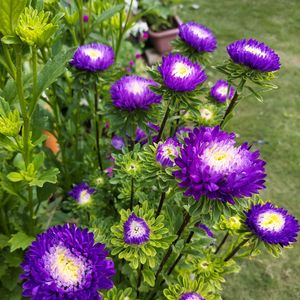モニターのアスターあずみXL 開花しました! パープルとホワイトが咲きました♪ 10号鉢に4株植えです。 ホワイトは背丈が他の色より高めな気がします。 長プランターに植えた方もパープルが咲きそうです✨ ピンクも咲いてくれないかな~?