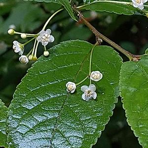 フウリン ウメモドキ(風鈴梅擬) ・モチノキ科・モチノキ属 ・分布域: 本州 四国 九州 ・樹高 2~3m ・雌雄異株 ・日本固有種🇯🇵 とても小さな花が葉の上に付く ので 下から見上げても気づきにくいです。 雌花は秋に小さなサクランボ🍒 みたいな実を付け 風鈴に見立てて この名前がつきました。 2024 6/13 📱妹撮影