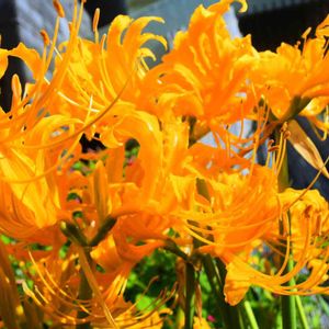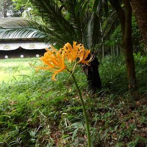 一昨日の紅白の彼岸花に続いて黄色の彼岸花です 黄色と言ってもオレンジ色に近いなぁ 呼び名はたくさんありますよ ショウキズイセン(鍾馗水仙) ショウキラン(鍾馗蘭) リコリス・オーレア 花言葉:「陽気」「元気な心」 寄り添うように清楚な青紫色の花を 咲かせようとしているのは カリガネソウ(雁草)です コロンとした蕾が可愛らしいね 花言葉:「清楚なひと」「楽しい思い出」