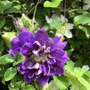 クレマチス 紫宸殿 毎年たくさん咲いてくれる紫宸殿ですが、去年地植えを掘り上げて場所移動したので今年は少しお花が少なめかな💦 奥の白いお花は先日載せた花園 白と紫のコラボです😊