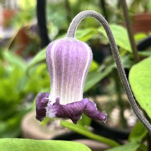 クレマチス 桐壺 開花しました🎵 壺型でも色々な形があって、この子はおちょぼ口さん そしてお口の中はグリーン 酸っぱそうなお顔してます🤭
