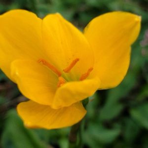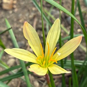 キバナタマスダレ ヒガンバナ科タマスダレ属 多年草 地中海沿岸〜中央アジア原産 和名はタマスダレに似ており、花が黄色なのでこの名が付いた。 花期9〜10月 高さ10〜25cm 径3〜5cmの鱗茎を持つ。 葉は長さ20〜25cm、幅0.7cmの線形。 葉と蕾は同時に地上より現れ1週間ほどで開花する。 花は茎の先に黄色い長さ4cmほどの漏斗状の6弁花を付ける。 葉は夏前に枯れ、夏は休眠する。