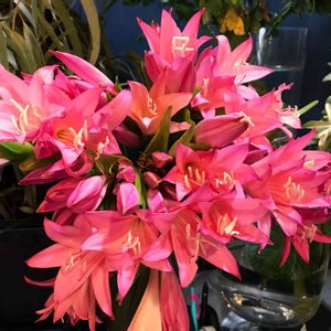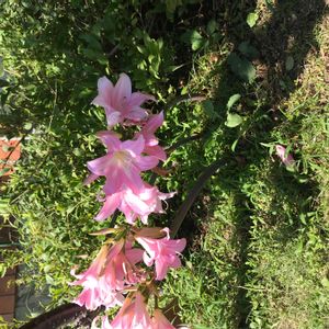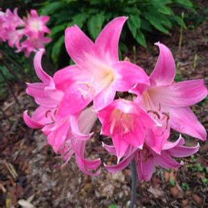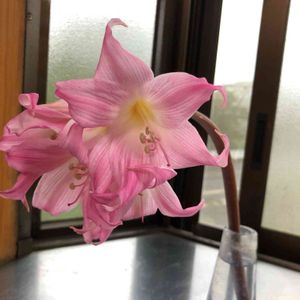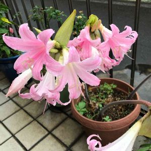 ナツズイセンに似てるけど、ちょっと違うみたい。 ベラドンナリリー? かな?? わかる方教えてください🙇♀️ うまく写せなかったけど、葉っぱは出てなくて、ぶっとい茎が一本伸びています。