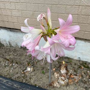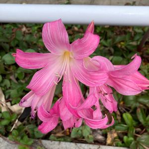 可愛いらしいピンク色🩷の ユリのような花が 金網のフェンスから道路側に 飛び出して咲いてました😆 もし 名前がわかる方がおられましたら 宜しくお願いします😊🙏 今日 10/5 📱 GSの心優しい皆さまから回答いただき ベラドンナリリー🌸とわかりました🤗