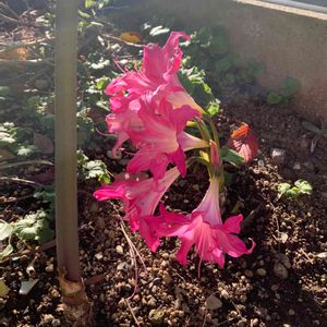 ベラドンナリリー・ピンク 開花しました😍😍 リコリスより花上がりが悪く毎年2〜3本しか花芽が上がりませんでしたが、今年は7本も上がりました!😆😆 リコリスよりも花が大きいので複数花芽が上がると迫力があります😆😆 甘い香りがあるのも良いですね! [余談] 今は紛らわしいのでベラドンナリリーで流通していることが多いですが、ベラドンナリリーは学名にすると アマリリス ベラドンナ(Amaryllis belladonna)となります。 つまりこちらが本当はアマリリスなのです😂😂 ちなみに普段アマリリスと呼ばれている花はヒッペアストラム(Hippeastrum)が本名です👍 ベラドンナリリーは南アフリカ原産でアマリリスが南米原産なので産地も全然違います😂😂