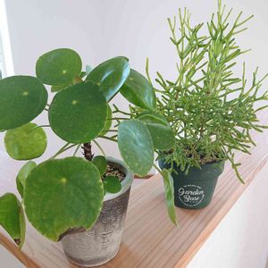 観葉植物記録★② ⬅️ピレア ペペロミオイデス 別名 パンケーキプランツ お迎えしてから3~4年😊? 子株が出て増える品種でこれまで何度も株分けし、実家や親戚にお裾分け😊 葉が丸まりがちで、水やり頻度がうまくつかめず😅 葉が枯れたり…(手前) 葉水とこまめな水やりでこの鉢はいい感じに育ってます🥰 ➡️リプサリス ハティオラ 白糸の滝 親株からカットして発根してから土に挿したもの😊 最近肥料あげたら元気🥰 多肉メインで育てていると観葉植物の水やりも忘れがちで… 今年は水やり忘れない❗をがんばる😊