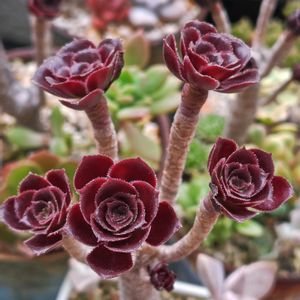 アエオニウムの記録 ①エッジローズ✖️富士紅錦 小さいのに子株沢山✨お迎えの時からだいぶ成長してました☺️丈夫でいいね👍❣️(お迎え📸2022/09/29) ②クジャク法師✖️ベルベットローズ、チョコチップ、小人の花束、アドニス こちらも少しずつ成長してます😊 クジャク法師〜だけお迎え時からの3頭のままだな🐸 ③メデューサ ツヤツヤ赤くてキレイ✨子株なし🐸