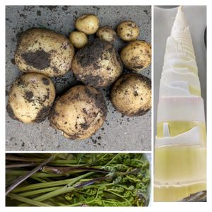 夕飯の味噌汁用にジャガイモを一株収穫しました。 それと散歩に行きタケノコと1回分のワラビも収穫です。