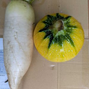 ズッキーニ(パリーノジャッロ)1個今回で2個目とダイコン(三太郎)1本収穫しました。 このズッキーニは茎を立てないといけないらしく 横になっていた茎を支柱で立ててきました、 次の雌花も見えた。