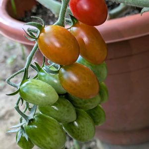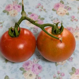 プチぜいたくトマト 初収穫しました。 右は追熟してから食べますが、左は即食べました 半分っこ、美味しかった(笑)。