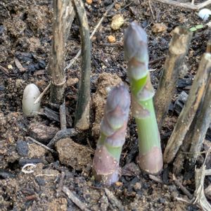 アスパラガスの芽が見えてきました 今、7本覗いています 比較的スリム(+_+)
