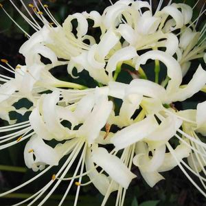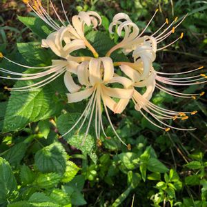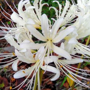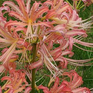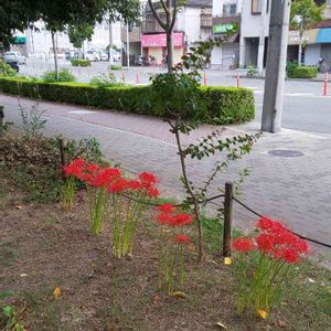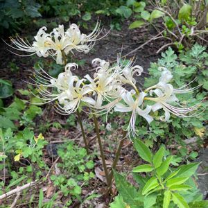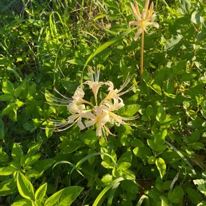 リコリス: シロバナマンジュシャゲ 毎朝通る道に咲きだしました。 白の横に赤い色も何日か後に咲きだしました。 いつも通っているのに咲くまで気づかなかった。 見つけたら気になって毎日見てしまい近くまで見に行きました。 近くで見たら白ではなくて少しクリ-ム色に薄いピンクのスジがある。