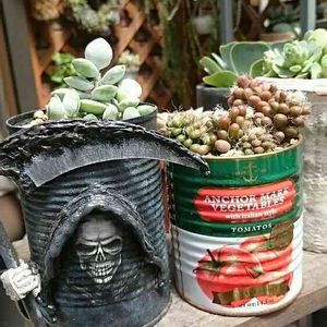 右の茶傘が内蔵色になったらこのどくろリメ缶に植えるぞ!と息巻いていたら、内蔵色ってよりウ◯コ色みたいになったので、頭骸骨みたいなアドロミクスの雪御所を植えました。💩▶💀 んー、、、 どうかなぁ。。。イマイチかなぁ。。。
