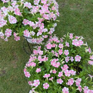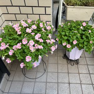 ①🔰とらネコ ✂️から2週間でフワフワに復活…葉っぱもこれまでのサフィニアとは違うね モリモリに咲かせるにはどうしたら良いのかな? フワフワで良いか〜😆 ②2連100円レスキュー🛟のももちゃん 8号鉢いっぱいになり咲き始めました 今年はモザイクでかわいいハートを見られなかったけど、この子達はハートです🥰 ③パルフェストロベリーとイチゴショートのイチゴのMIX サフィニアとカリブラコアだから一緒に咲かないね💦 パルフェが満開過ぎたので✂️したらイチゴが咲き出しました