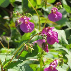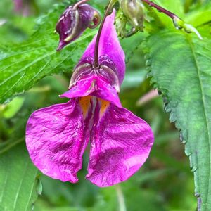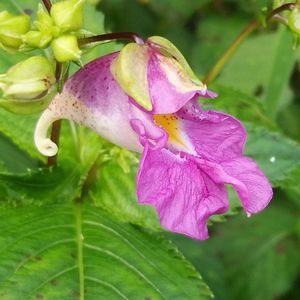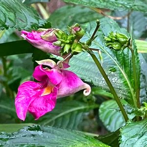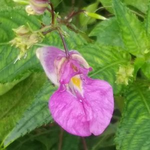釣船草のお花が綺麗に咲いていました。🌸 八方ヶ岳(熊本県)登山道にて 2023年8月13日撮影 登山道の横には 清流が流れていますので 真夏でも 割と涼しく登れます。 沢登りコースで登りました。 登山口からすぐに咲いていました。 下山中 雷⚡️が鳴りだし にわか雨☂️ 木々が傘になり 余り濡れずにすみました。 雨に濡れた 釣船草が 生き生きして見えます。💦💦🌸💕 私は 汗💦で 全身ずぶ濡れ 久しぶりの登山で堪えました⛰️ 調べました。 科名 ツリフネソウ科 属名 ツリフネソウ属 学名 Impatiens textorii 別名 釣船草・吊舟草 水やり 水を好む 場所 外の半日蔭 難易度 初心者向け ツリフネソウ(釣船草・吊舟草)はツリフネソウ科ツリフネソウ属(インパチェンス属)の北海道から九州の山地の半日陰の湿った場所や、水辺の近くに生える一年草。花いろは紫ですが、白いもの(シロツリフネソウ)やキツリフネ(Impatiens noli-tangere)もあります。細い茎に独特な花を山では夏(8月)から平野では秋(9月〜10月)に咲かせる。野趣があり、派手で無い。育てるのは難しくないが、玄人好み。 春から夏に掛けて苗を購入して植え、夏が終わりかけたころに花が咲き、冬には枯れます。花に種が出来ると、はじけて周囲に飛び、それが翌年の春に芽を出します。一度植えると毎年生えてきます。 春から夏の定番植物のインパチェンス(Impatiens walleriana)とは同属です。 草丈40cm〜80cm 特徴・由来・伝承 文章の修正インパチェンスやホウセンカの仲間で、一年草。ツリフネとは生花の花器のことでこれに似ていることからきています。ツリフネソウ属の植物は主に山地・熱帯地域によく広がり、800〜1000種あるとされます。花には「距(キョ)」と呼ばれる部分があり、ここに蜜がつまっているので口が長い虫がやってきて蜜を得る代わりに花粉を媒介します。実が熟すと、はじけて種子を飛ばして、翌年も芽を出す。花の時期は8月~9月、暖地では9月~10月。和歌では晩夏から秋の季語。 皆様 今日もお元気でお過ごし下さいね🥰