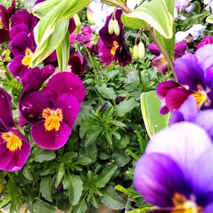 ビオラ💗🧡🌿 プチシャトン・モダンタイムス & ナルコユリが出てきました✨ 斑入の葉に白い下向きのお花🤍🤍🌿 が二つづつ🤍🤍✨🌿下がってまず🤗✨ & 紫のビオラ💜✨🌿