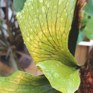 おはようございます🌤 今朝の気温 25.8℃ 湿度 68% アルシコルネ(ver.Africa)のはず…w 前々から奇形か薬害かと観察していますが、貯水葉と胞子葉の中間葉が😅💦 見えます?葉柄の伸びた貯水葉w 彼はどうなりたいのだろう 笑 まぁある意味 楽しみ🌿