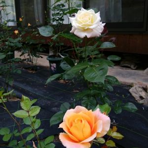 今日の狭〜いお庭。 ダブルピンクノックアウト 葉っぱ、あまりないけど、咲いてます。 お友達から頂いた、クイーンエリザベス 3番花です。キレイに咲いていますよ。 嵐の前の静けさ⁉️月が出ています💦 背の高い鉢植え、避難しましたが!片付けきれずお庭に居るお花達、ごめんなさい。