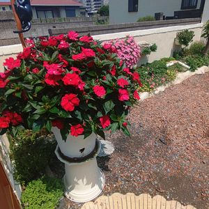 【インパチェンス 暑熱順化】 インパチェンスの連投になります… 本日 最高気温34度 ヤバい気温になりましたが なんと インパチェンスは 炎天下の元すくすく成長 流石 夏の植物成長が早すぎ 一昨日の投稿から 更に1日中太陽光が当たる場所に移動したら 一気に一回り大きくなりましたね アミノ酸施肥してますが これは 気温との関係性ですね pic2 多分10cmは伸びてると思う… pic3 2日前の姿 pic4 ウォーターポット底面給水型 約2リットルの水をストック 今回は インパチェンスは 太陽光の元で育てた方が大きくなるんじゃね?と思い 3ヶ月前から外で順化育成した感じです。 順化とは何か? Googleコピペ ↓↓↓↓↓↓ 植物の暑熱順化とは、植物が暑さに慣れるために、徐々に環境温度を上げていくことを指します。具体的には、春から夏にかけて、徐々に日照時間を長くしたり、水やりを調整したりすることで、植物が暑さに耐えられるように環境を整えます。これにより、夏場の生育不良や枯死を防ぐことができます。 まっ 順化育成とは 徐々に 環境に慣らす育成で このインパチェンスは 3ヶ月位順化育成してましたね そもそもインパチェンスは アフリカの横にある島 マダガスカル 気温30度以上の赤道に近い暑い島に生殖してる植物 なので 今の日本の気候に適してるのですよね さて ここで日本の園芸での矛盾が 発生する訳よ……… インパチェンスは半日陰で育成… 販売苗が 順化されてないので 日陰 半日陰と言われているんですよね 今回 本当は日本の真夏の外での育成がが適してる証明をしてみたく 順化育成した感じですね まっ 見ての通り結果が全て しかも 日に日に更に成長してる 日本の猛暑が好きなんですよね これ ウォーターポットだから 出来る訳で ウォーターポットの底面給水 2 リットルのストックは 夕方には無くなります… インパチェンスは 水切れすると しなしなになるのですが これが中々復活と行かず 葉が枯れ枯れになるのよ そうなると多く葉を失うと復活まで大変なので 水切れがヤバい 特に 株を大きくすればするほど 1日当たりの水分量は ハンパ無い それは 株が大きくなる程 沢山の葉が蒸散するのよ よって蒸散と吸収は 比例して 当然上部株が大きくなると 水分吸収も大きくなるて事ですね このインパチェンスは 朝2リットル 夕方2リットル 少なくても4リットルは消費してますね 上からの潅水もしてるのでそれ以上かと… 以前は これほど大きく育て無かったので 洗面器を受け皿代わりにしてたのですが ウォーターポットにしたので 1日2回の潅水でギリセーフて感じですかね 更に大きくなったら 間に合わないと思います。 上部株を切って小さくすれば楽になるとは思いますが…😅💦💦