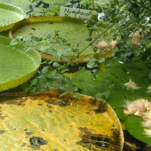 《小さい子供ならば乗れるよ🧒》 スイレン科オオオニバス属に属する水生植物の1種🤗 直径 2 メートル 以上になる巨大な浮水葉を水面に浮かべることで知られている。南米のアマゾン川流域に生育し、植物園などで栽培されることもある。🤗🌸 ここはデンパークです🌼 「君の名は」