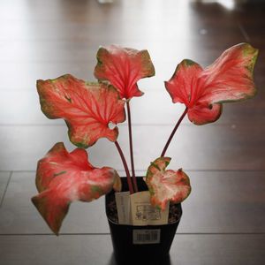 カラジウム・バイカラーフラミンゴ🦩 お店では品種が分からない状態で売られていることが多くて敬遠していたのだけど、今回はちゃんとわかる形になっていたので購入。 赤いからフラミンゴなのかくらいに考えてたけど、絵文字の🦩と色がそっくり‼️ 白とピンクの色合いがホントにフラミンゴカラーなのね😅 カラジウムはこれまで持ってなかったので、上手く育てられるか不安&楽しみ😆