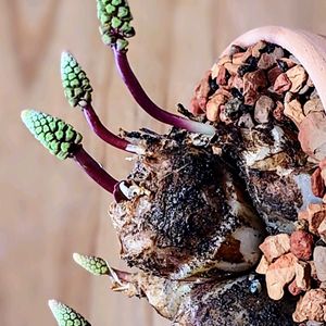南アフリカが故郷 ケ-プバルブの仲間 ドリミオプシス ブルケイ 春に球根から葉よりも 先に濃い光沢のある 赤紫色花茎が伸びて 可愛らしい小さな花を咲かせる✨ まるでツクシのような形 緑色のツボミの集団に 春の到来を実感する🥹 ヒマワリのように太陽に向かって東に向いてる姿 全員右へナラエ〜😆