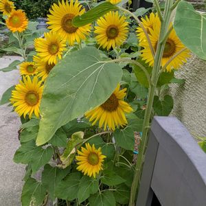 いっぱい咲いてる鉢植えのヒマワリです。撮らせて頂きました。奥さまにお聞きしたらご主人の誕生日のプレゼントはいつもヒマワリの種で、孫から朝顔の種がプレゼントされるそうです。毎年二階のベランダから朝顔のつるが一階まで伸びてます。植物の世話はほとんどご主人がされてます。