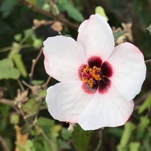 ヤノネボンテンカ(矢の根梵天花) 一番花開花しました。 小型の白い花の中心部が赤褐色です。 別名:タカサゴフヨウ(高砂芙蓉) ミニフヨウ