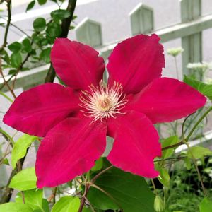 我が家のクレマチスさん達❇️🌸💮❇️ ①レベッカ満開です❤️ 手のひらを広げたより大きいお花です💞 ②開花4日目の揖斐 花びらが白っぽくなって来て、蕊も点々みたいに…🤍 ③開花したばかりの揖斐 花びらが薄いピンク色がかっています💮 蕊もくっきりして固まっています💜 ④⑤四季咲きサマリタン・ジョー🩷💜 咲き始めの縁取りがかわいい💜