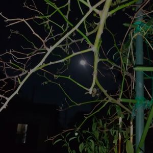 つるバラ バレリーナとヤマホロシの間から見た月。 僕は夕方まで寝てたから、寝待月❓️😱 風邪には勝ったどー😁🎶🎶
