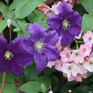 イングリッシュガーデンにて撮影 クレマチスさんと小ぶりのバラのバレリーナちゃんの共演 💜💗🤍💚