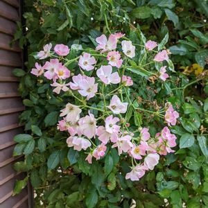 今日の庭pic。つるバラバレリーナ、やっとピンク🩷色で明るい笑顔を現しましたよ〜。