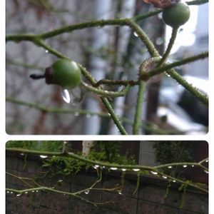 🏷️0の付く日は雨粒の日 地味な写真です。先日の夕立、雨が凄すぎて外に出られず、玄関にて。 まだ青いバラの実。