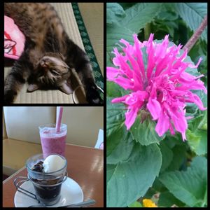 ニャンコ地域猫 布団から落ちても寝てます😴 番外編 暑いから冷たい物でも いかが😅 モナルダ 最後に咲いたの です🌸 おはようございます m(_ _)m 今日は⛅️