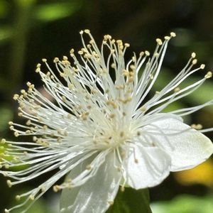 近くの神社で 花弁よりも蕊の方が目立つ真っ白いお花です 蕾もまん丸で可愛いです 別名 マートル、イワイノキ