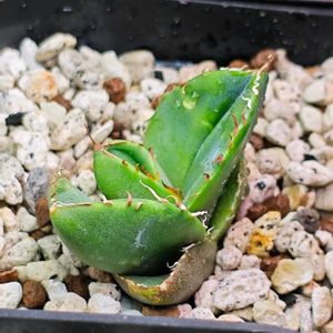 怪しいアガベのその後 ①月蝕 斑が消えました。厳密に言えば斑はどこ? くらいの斑があるようなないような。 ②鰐亀となんちゃらの交配 なんだかわからない姿。 ③ホオジロザメ 徐々に鋸歯が黒→グレーに。 こっちはまだ判別しがたいです。 アガベガチャにハズレあり! 否、ハズレばかり!