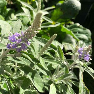 トウテイランが咲き始めました シルバーリーフに紫のお花 爽やかだわぁ(´∀`) この子は株分けっ子 親株はどうなってるかな〜 、って、また蚊に襲われて🦟私が退散💦 後ろの黄金葉は、 紫蘇です😆