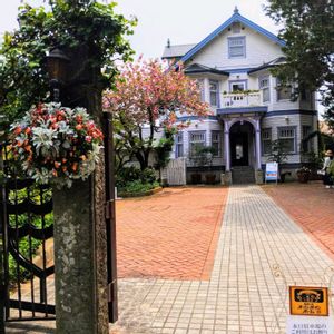 大磯オープンガーデン2025🌿 大磯迎賓舘にて🏡 大磯駅から直ぐの場所にあり入り口にビオラとシロタエギクのハンキングが素敵に飾ってあり、奥には八重咲きの桜が咲いて綺麗でした🌸