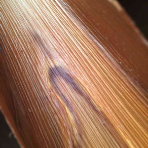 イラワラの葉焼けした個所。 しばらくすると白く掠れた部分が茶色に変色する筈…(経験あり(>人<;) 経過観察中です。
