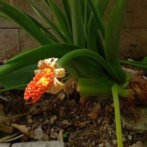 クワズイモの花が咲いたあとに、オレンジ色の実がなりました🧡庭に住んでるメジロが食べに来てました🐦️