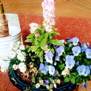 今朝のうちの寄植えたち🥰🥰🥰ストックが元気になり、ビオラさんも、みんなこちらを向いて👍ぐるぐる写メ📷✨撮って〜🙌アピールしておりますケロ🐸✨クワマン🍠もマフラーを外して春を待ちます🌸✨