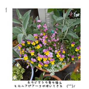 おはようございます🤗 お天気は☁空の Gardening日和です♪ 本日初投稿!! これから、お庭の花達の記録用にアルバムを始めたいと思います♡ 記念すべき1枚目は、冬から咲いて癒してくれた花 ※ビオラさん(紫と黄色) ※ボロニアピナータ(赤紫)※アリッサム(白)※ラムズイヤーの寄せ植え鉢です。 ビオラさん、徒長してきて時折風にゆらゆら揺れて、癒される~♡