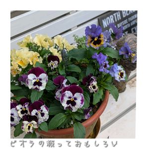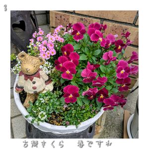 ビオラの寄せ植えパート3 冬の寒い時期にビオラを選んだからか? 改めて写真に収めたら暖色系が多い事に気がつきました😆 この鉢はビオラと、ガーデンシクラメン、アリッサムで寄せ植えしてましたが、シクラメンは、地植えへお引越しして、プリムラ古都さくらをいれてみました🌸 くまさんには水撒き依頼🤭 小さな置物って 癒されるな~♪