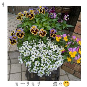 ビオラ鉢植えパート4 フリルビオラさん 2種類とアリッサム、北側玄関なので、中々盛々してくれなかったけど 気づけば、盛々ちゃんにちゃんとなってました😂 はみでましたね~😆
