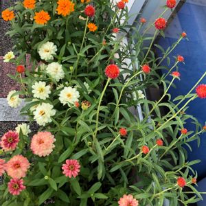 🧡月曜日は元気色の花🧡ྀི🤍💖 薬局の前に、可愛( 💓∀💓)お花いっぱいでした。 ① 可愛い寄せ植え。千日紅。ジニア。 ②ハツユキカズラ。 ③ルリマツリ。 ④夕焼け。今日も一日お疲れ様😊😊😊