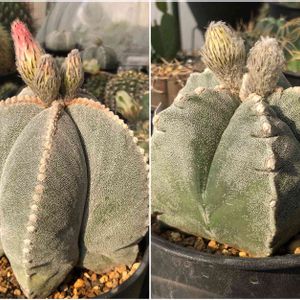 GWに、茨城のカクタスブライトさんからお迎えした亀甲さんと、今回長野の高木カクタスさんからお迎えした恩塚さん。🌵 真上からの撮影の為、恩塚さんの方が鉢に高さがあるので、実際には亀甲さんの方が一回りでかいのですが、模様が違うだけで、兄弟なんじゃないかってくらい同じフォルムでびっくりしました〜!😅💦 大きさは亀甲さんが直径9cm、恩塚さんが直径8.5cmなのですが、交配すると負担になってしまうと思うので、もう少し大きくなってから交配した方が良いような気がしています。🌵 交配、実生について、たくさんの疑問が出てきたので、今度プロの方に伺いに行かきゃだなぁ!🌵☺️🌵