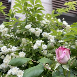 . シャンプーニーピンククラスターに 絡まって 羽衣ジャスミンも咲いてるね
