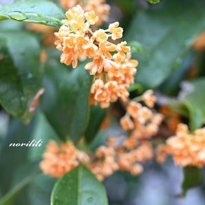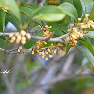 「今日のお花」 金木犀です。 皆さんの投稿できれいに咲いている 金木犀をみせてもらい、まだかなまだかなって 思ってました。 昨日、どこからか香りがしてきて・・・ まだ蕾ですが、いい香りをかいでます。